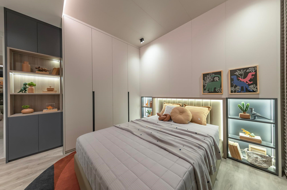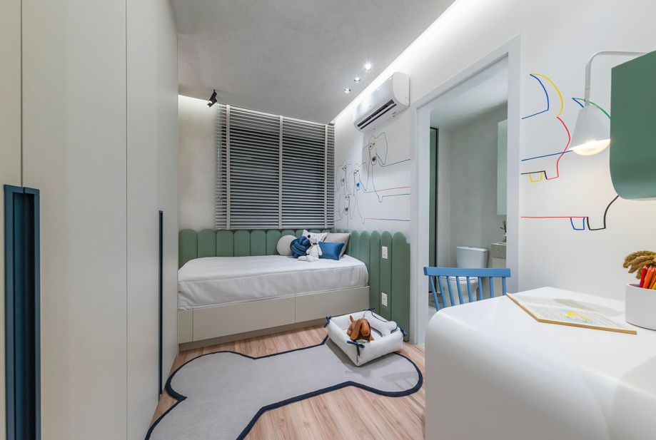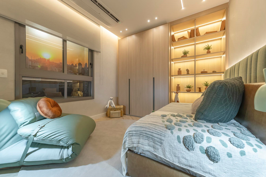 “Promover um ambiente onde a criança se sinta ‘em casa’ dentro do próprio quarto auxilia em diversos aspectos. Uma decoração temática, harmonizada com brinquedos e enfeites, favorece o desenvolvimento cognitivo e o bem-estar”, explica Juliana. No decorado do empreendimento Icon, em Campinas (SP), o quarto se destaca com a utilização de quadros, enfeites e brinquedos de dinossauro, estimulando a criatividade infantil.