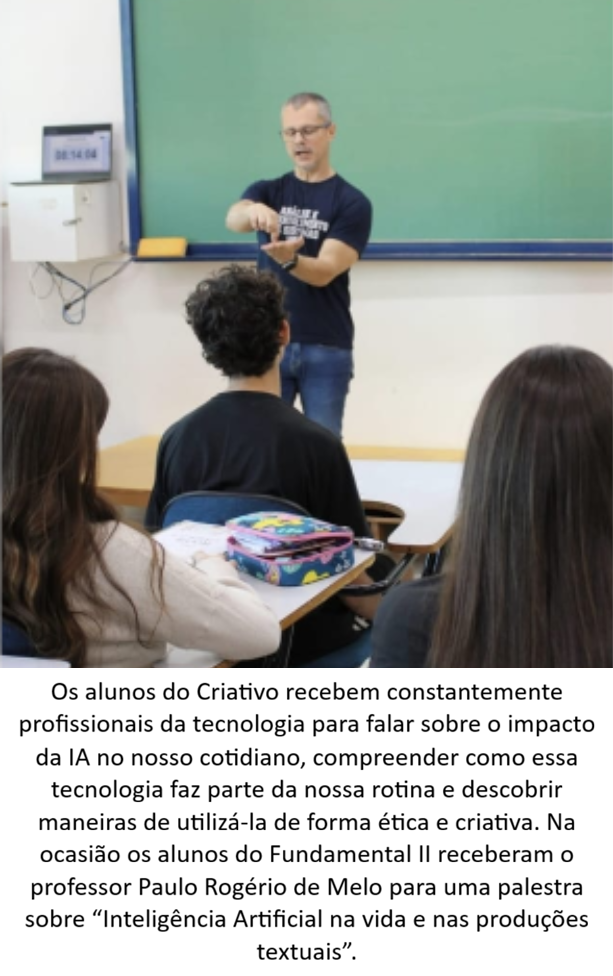 Considerando também o avanço da tecnologia, destaca-se a Inteligência Artificial como grande aliada na transformação das práticas educativas, na construção de novas formas de ensinar e aprender, favorecendo metodologias ativas, e personalização do ensino por meio de plataformas adaptativas, dentre outras. No Colégio Criativo, essas ferramentas digitais ampliam o acesso ao conhecimento, potencializam a autonomia dos alunos e enriquecem as práticas pedagógicas, tornando as aulas mais dinâmicas, interativas e conectadas à realidade contemporânea.