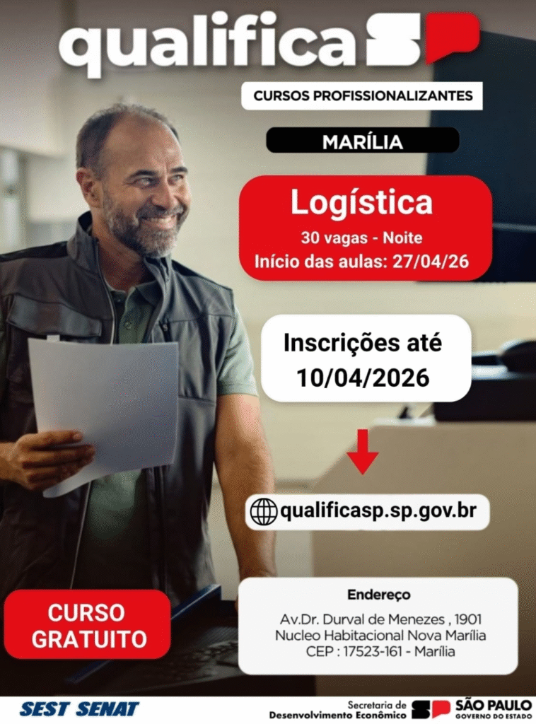 A Prefeitura de Marília, por meio da Secretaria do Trabalho, Turismo e Desenvolvimento Econômico, apoia a divulgação do curso gratuito de Logística oferecido pelo Qualifica SP, em parceria com o Sest Senat.