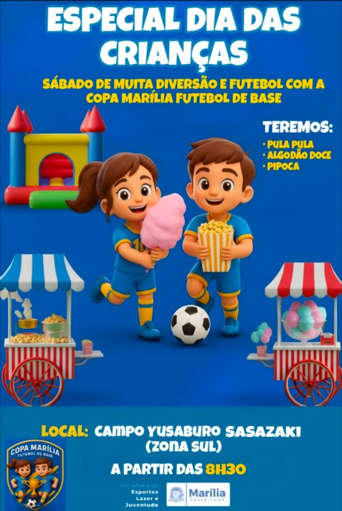 Copa Marília de Futebol de Base tem rodada especial em comemoração ao Dia Das Crianças. Mais de mil atletas nas categorias Sub-11, Sub-13 e Sub-15 nas Séries Ouro e Prata. É amanhã. Veja onde