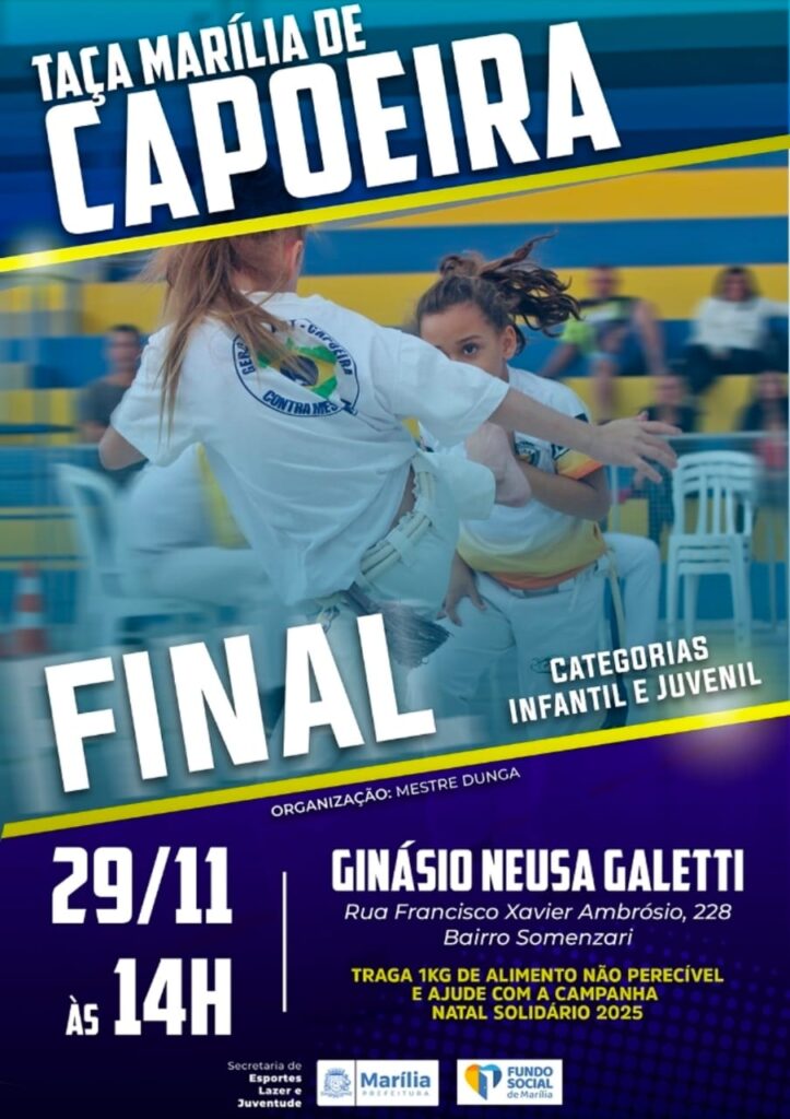 Será realizada no próximo sábado, 29 de novembro, às 14h, no Ginásio Neusa Galetti, a final da Taça Marília de Capoeira.