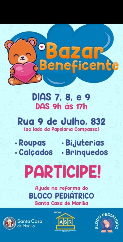 Em parceria com a ASR (Associação de Senhoras de Rotarianos), será realizado nestes dias 7, 8 e 9 de outubro, das 9h às 17h, em espaço na rua Nove de Julho, 832 (centro da cidade) – ao lado da Papelaria Compasso – Bazar Beneficente em prol da reforma e ampliação do Bloco Pediátrico da Santa Casa de Marília.
