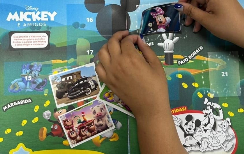 O álbum traz 60 figurinhas, sendo 20% delas especiais e metalizadas. Cada envelope inclui quatro cromos colecionáveis, com imagens de franquias amadas como Stitch, Frozen, Toy Story, Os Incríveis, Moana, Carros, Disney Princesa e Mickey & Amigos.