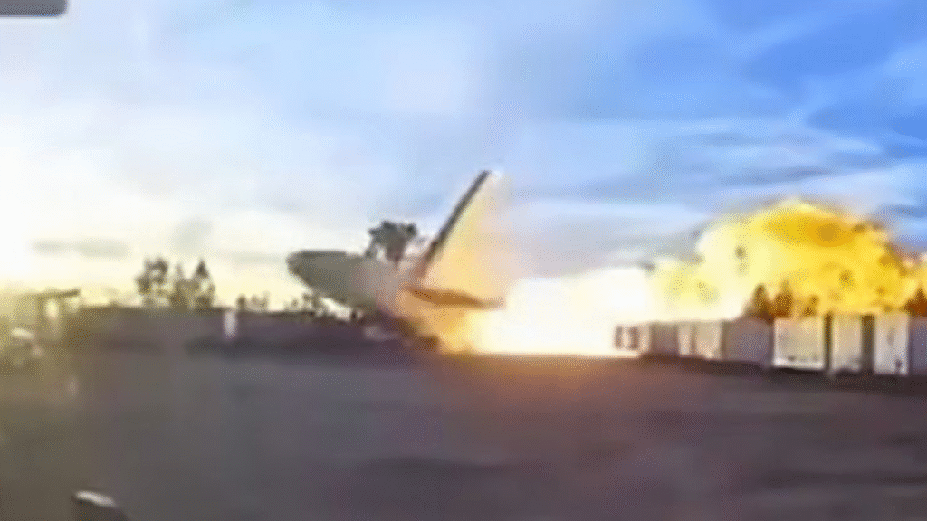 Imagens que circulam nas redes sociais mostram chamas na asa esquerda do avião e uma trilha de fumaça durante a decolagem. A aeronave chegou a se erguer levemente do solo antes de cair e explodir.