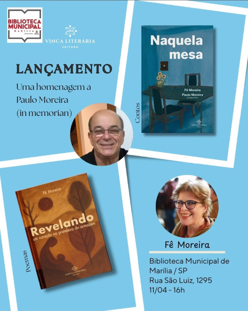 A Biblioteca Municipal de Marília será palco de um evento literário especial neste sábado (11), a partir das 16h. A escritora Fê Moreira realiza o lançamento de duas obras que homenageiam a memória e o legado de Paulo Moreira, em uma programação marcada por emoção, cultura e valorização da literatura.