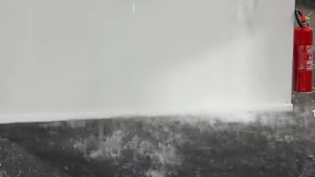 Imagens registradas no local mostram a água escorrendo com intensidade e formando poças no chão, onde um extintor de incêndio chegou a ficar submerso.