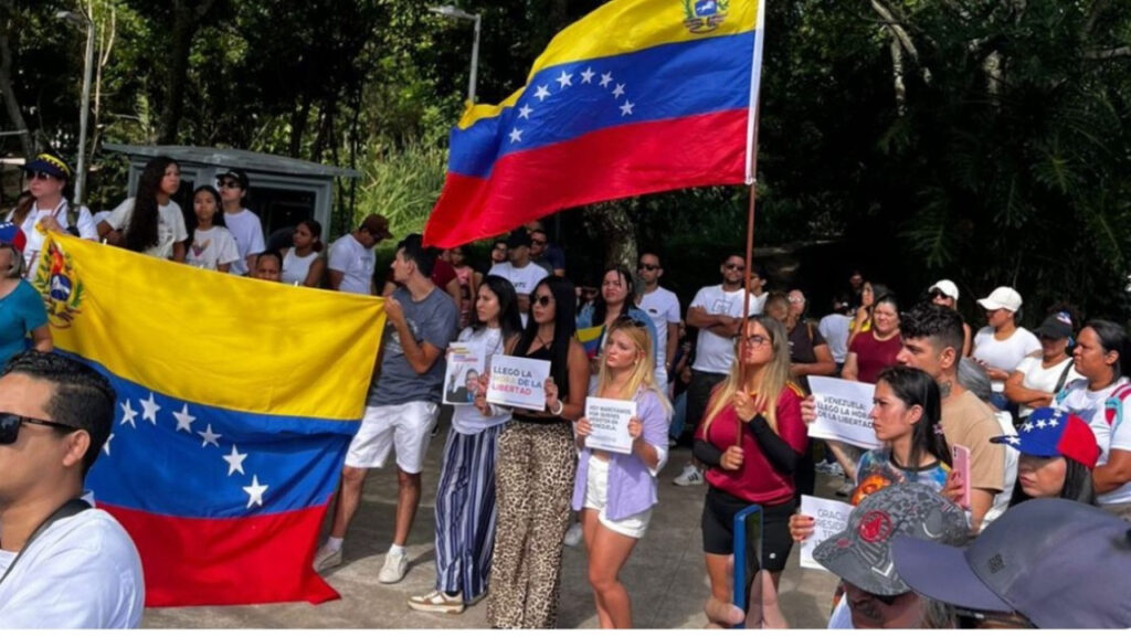 Com bandeiras, cartazes e gritos de liberdade, o ato reuniu pessoas que deixaram a Venezuela nos últimos anos em razão da crise política, econômica e humanitária vivida no país.