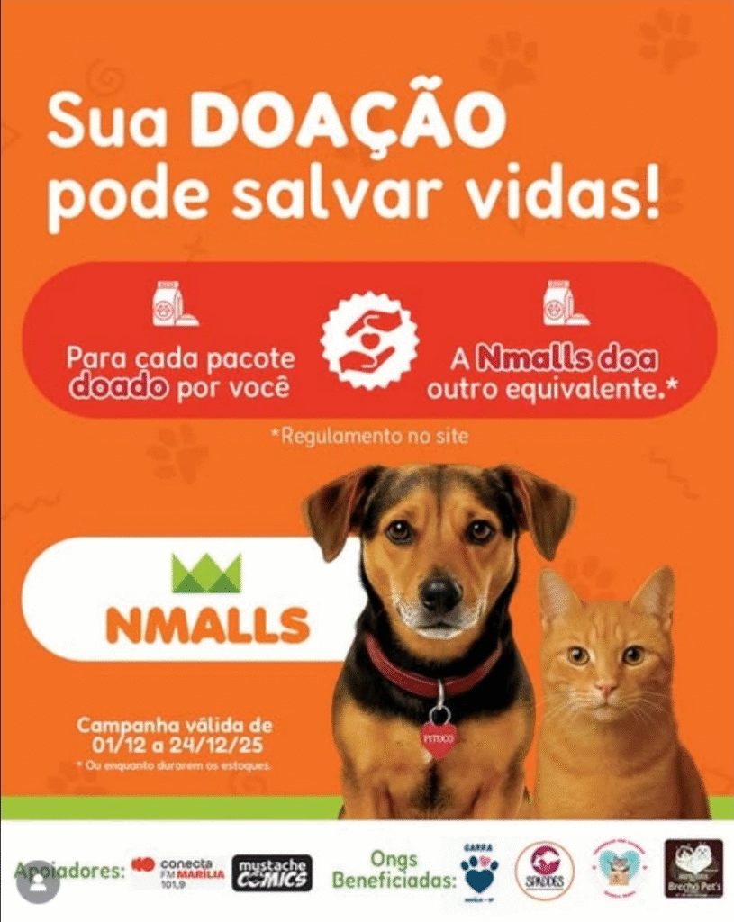 A cada pacote de ração Nero ou Max doado por clientes na loja física ou site, a Nmalls doará outra unidade de igual peso. A meta é garantir uma tonelada de mantimentos para cada uma das quatro instituições, transformando o consumo em um ato direto de socorro aos animais que aguardam por um lar.