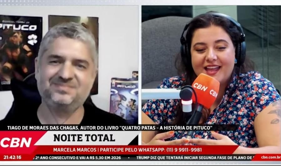 Transmitido pela CBN SP, o jornalístico ‘Noite Total’ pode ser acompanhado pelo YouTube (https://www.youtube.com/live/mylO3XP8–E?si=phE3IySspIRkoqH9, o trecho da conversa começa a partir dos 33 minutos). O autor pôde explicar todo o processo criativo, a evolução do livro em capítulos e despertou a curiosidade da apresentadora Marcela Marcos principalmente no que se refere à adoção do viralatinha e a relação de Pituco com o filho de Tiago, Lucas.