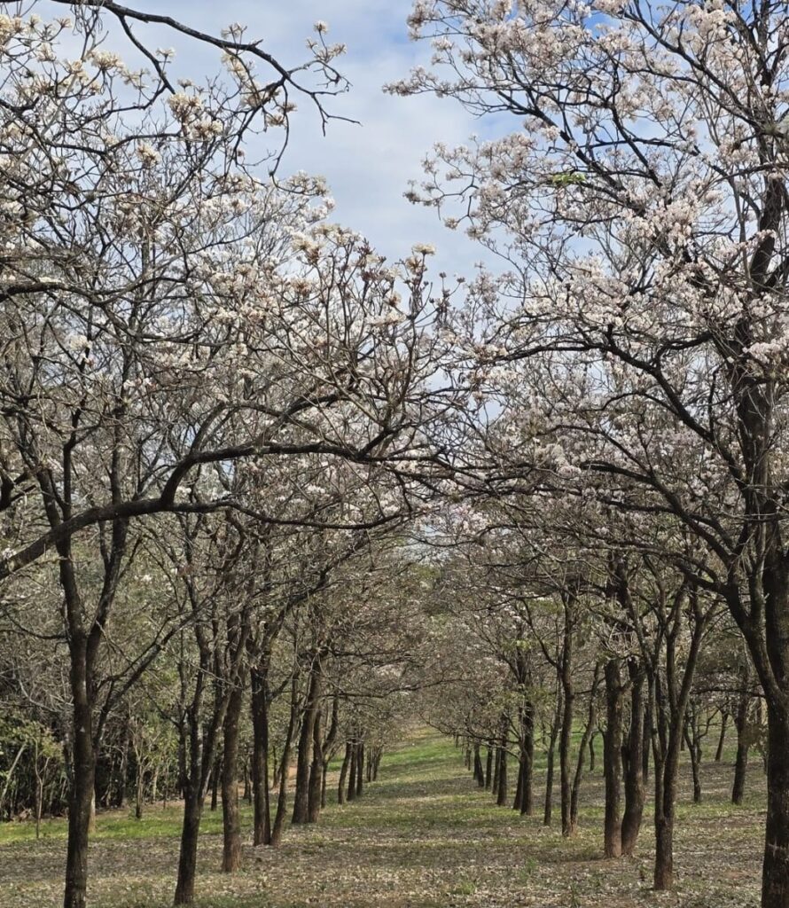 A florada dos ipês brancos é um evento natural de curta duração e, por isso, a Secretaria do Meio Ambiente e Serviços Públicos reforça o convite para que a população visite o Bosque Municipal e aproveite o cenário especial enquanto as flores permanecem abertas.