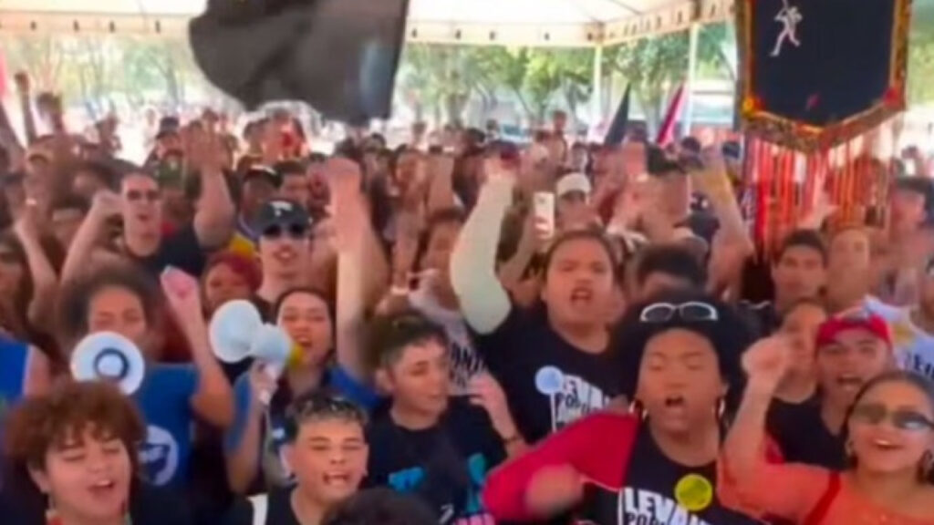 Nos vídeos que circulam nas redes sociais, eles aparecem com bandeiras de partidos, camisetas com frases políticas e entoando cantos ligados a movimentos estudantis.