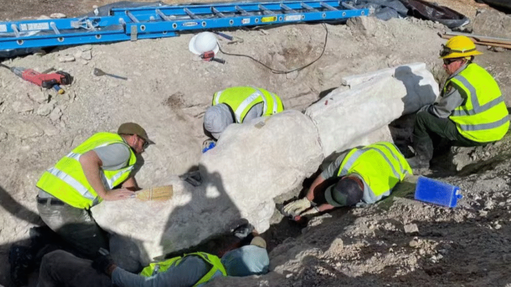 As ossadas foram descobertas após a remoção do asfalto, que revelou uma porção do arenito que continha os fósseis pertencentes a um dinossauro grande e de pescoço comprido. Os paleontólogos acreditam que se trata de um Diplodocus, espécie comum na área do sítio, que viveu há cerca de 70 milhões de anos.