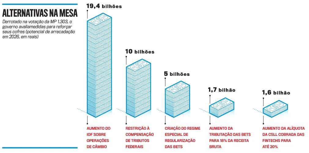 Na batalha do tudo por dinheiro, uma das possibilidades é o Planalto tentar novamente uma mordida no IOF, algo que na nova configuração poderia render quase 20 bilhões de reais em 2026 (veja o quadro). Essa e outras medidas se somariam a trechos da MP 1.303 que não enfrentaram resistência da oposição, a exemplo da compensação de tributos federais, que poderia injetar cerca de 10 bilhões de reais nos cofres públicos no próximo ano. Em contrapartida ao aumento da arrecadação, o governo colocou na mesa medidas tímidas de contenção de despesas. Uma delas seria a redução de 4,8 bilhões de reais no programa Pé-de-Meia, que concede incentivo financeiro a alunos do ensino médio.