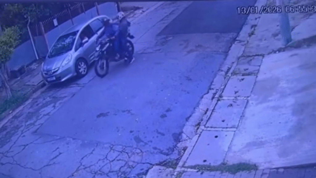 As gravações mostram dois criminosos em uma moto abordando a motorista de um carro e exigindo joias. Poucos segundos depois, um dos assaltantes corre em direção ao comparsa, que aguardava alguns metros à frente na motocicleta.