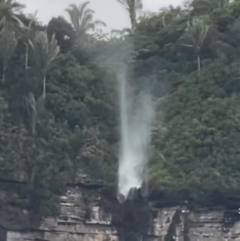 O vídeo foi registrado pelo visitante Júnior Aguiar, na Cachoeira da Murimbeca. Nas imagens, rajadas de vento empurram a água para cima, criando a impressão de que a queda d’água está invertida.