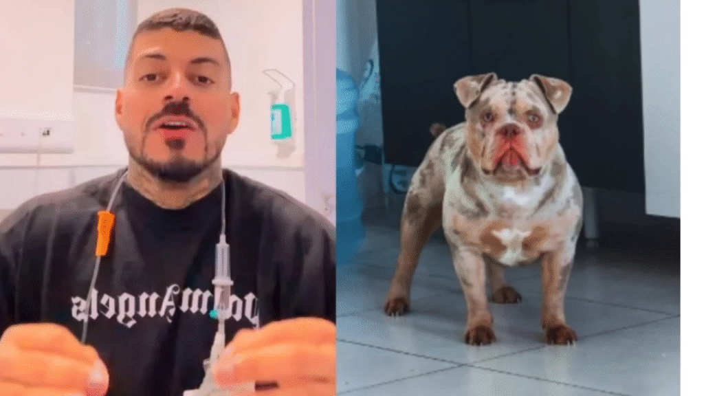 O influenciador explicou que o cão, da raça american bully, chegou a engolir o dedo.