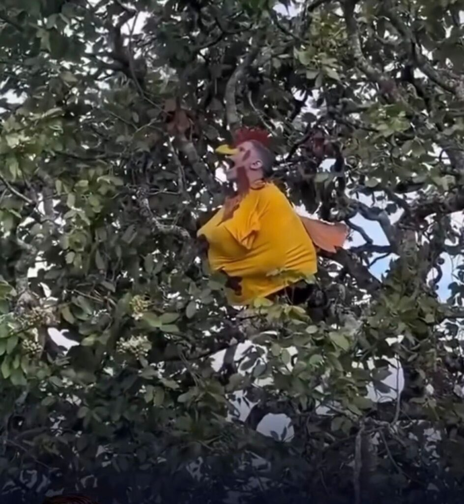 Um vídeo mostra um homem vestido com uma fantasia de galinha no alto de uma árvore. Enquanto a câmera registra a cena, ele emite sons semelhantes aos de uma ave, chamando a atenção de quem grava e de curiosos ao redor.