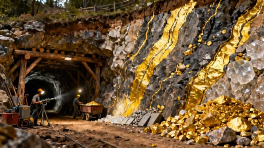 A geologia da região — com veios de quartzo, ardósias alteradas e brechas — segue o padrão clássico de sistemas de ouro hidrotermal.
