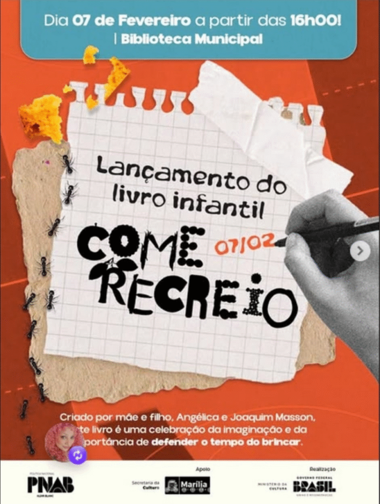 Os autores Angélica e Joaquim Masson – mãe e filho, respectivamente – lançam, neste sábado, dia 7 de fevereiro, às 16h, o livro infantil ‘Come-recreio’ na Biblioteca Municipal de Marília.