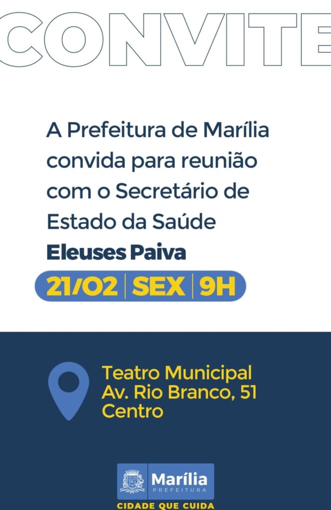O município de Marília recebe nesta sexta-feira (21), a partir das 9h, no Teatro Municipal “Waldir Silveira Mello”, o secretário de Estado da Saúde, Dr. Eleuses Paiva, para tratar de investimentos na área.