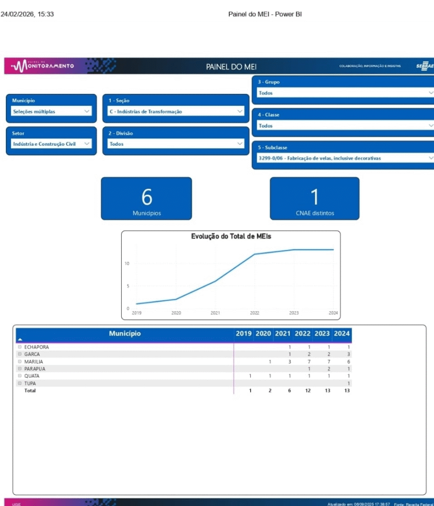 Segundo o Painel do MEI do Sebrae, dos 40 municípios atendidos pelo Escritório Regional do Sebrae-SP em Marília, seis já possuem registros de MEIs ativos no setor de fabricação de vela e esse número aumentou de 6 em 2021 para 13 em 2024 (Marília, 6; Garça, 3; Parapuã, 1; Tupã, 1; Quatá, 1; e Echaporã, 1).