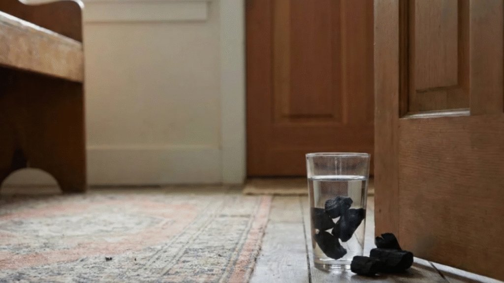 O carvão vegetal possui uma estrutura porosa que, no imaginário popular, atua como uma esponja capaz de sugar as vibrações pesadas do ar. Quando colocado em um copo com água, acredita-se que ele purifica o campo vibracional da entrada principal, impedindo que sentimentos ruins atravessem o umbral. Esse uso prático reforça a sensação de proteção dentro do lar familiar.