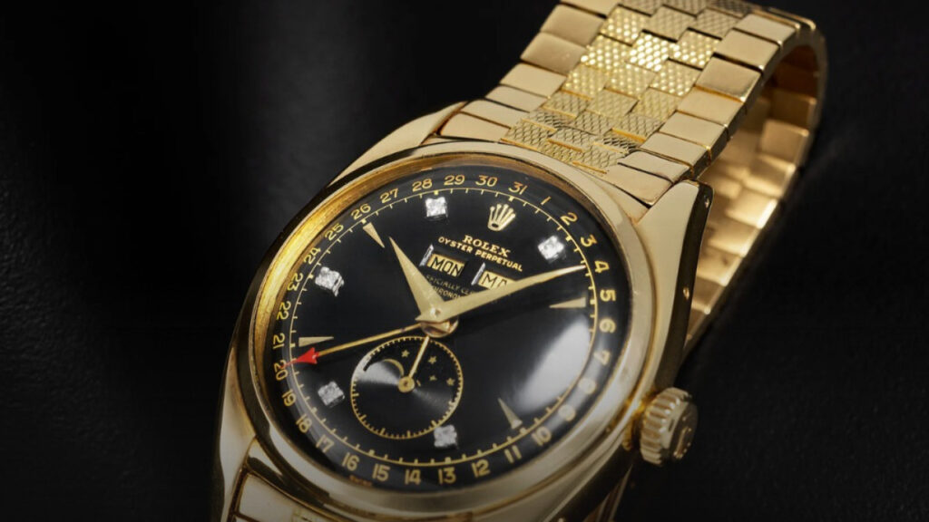 Lançado em 1950, o relógio combina calendário triplo, fase lunar e caixa Oyster à prova d’água e teve produção estimada em apenas cerca de 350 unidades. Dentre elas, apenas três são conhecidas com essa configuração de mostrador, o que reforça a excepcionalidade da peça.