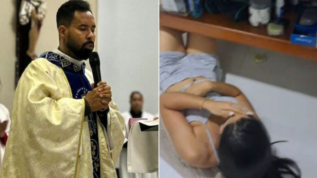 - Nas imagens, o pai do noivo registra o momento em que o padre, vestindo apenas um short, aparece na residência paroquial.