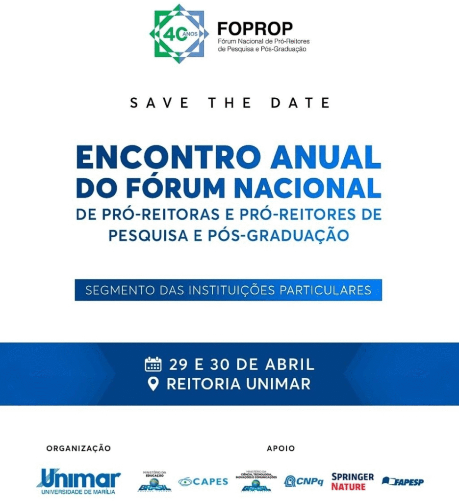 Promovido pelo Fórum Nacional de Pró-Reitoras e Pró-Reitores de Pesquisa e Pós-Graduação (FOPROP), entidade que articula cerca de 300 instituições associadas em todas as regiões do país, o encontro reúne representantes da CAPES (Coordenação de Aperfeiçoamento de Pessoal de Nível Superior), fundação do Ministério da Educação (MEC), da FAPESP (Fundação de Amparo à Pesquisa do Estado de São Paulo) e da Rede Nacional de Ensino e Pesquisa (RNP-MCTI), além da participação institucional da Springer Nature, uma das maiores e mais influentes editoras acadêmicas e científicas do mundo.