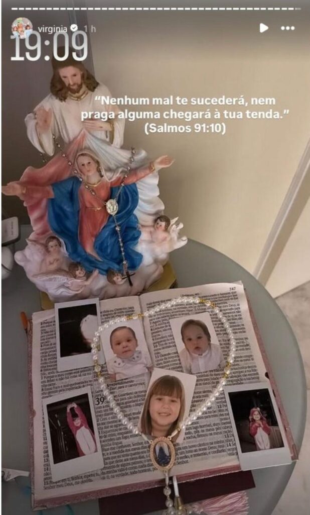 Na postagem, Virginia compartilhou uma foto de uma Bíblia aberta, com fotos dos filhos e um terço, acompanhada de um santinho com a imagem de Jesus rodeado de Maria e anjos. Além disso, escreveu o Salmo 91:10.