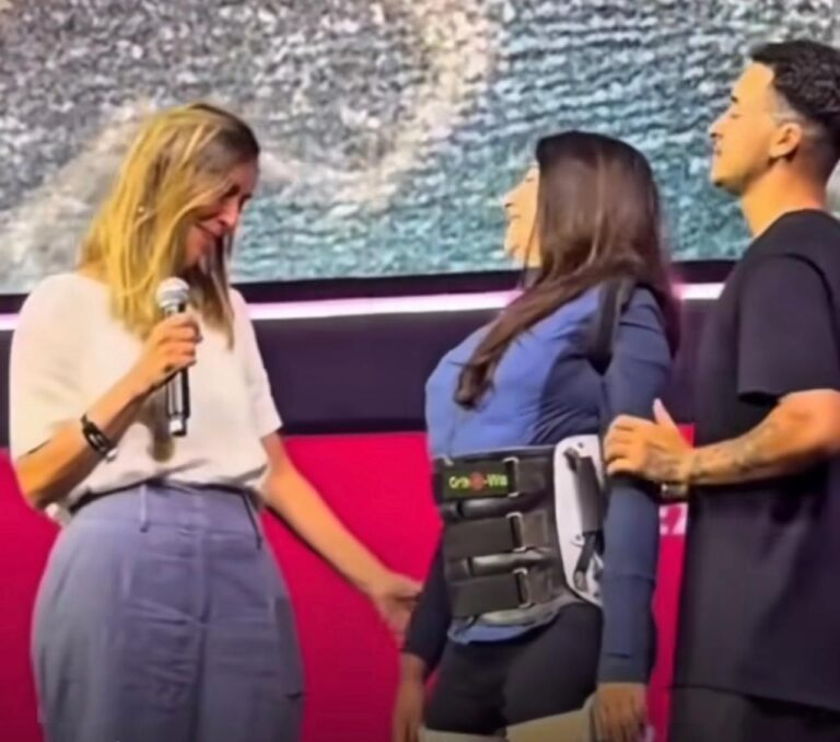 Laís Souza apareceu em pé e caminhando com ajuda de uma órtose e de seu fisioterapeuta durante um evento, em São Paulo, nesta quinta-feira (16). A ex-ginasta, que ficou tetraplégica após um acidente de esqui em 2014, esteve no local para entregar um prêmio à pesquisadora Tatiana Sampaio, que lidera a pesquisa sobre a polilaminina