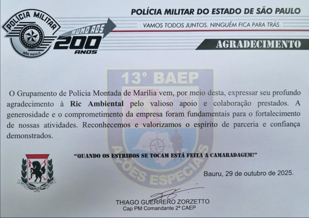 A RIC Ambiental participou, na manhã da última quarta-feira (29/10), da solenidade em comemoração aos 40 anos do 13º Batalhão de Ações Especiais de Polícia – BAEP, em Marília. Durante o evento, a concessionária recebeu uma homenagem especial em reconhecimento ao apoio prestado na reforma do estábulo do efetivo de cavalos do batalhão, uma ação que visa trazer melhores condições sanitárias e estruturais para os animais utilizados nas operações policiais e em eventos comunitários.