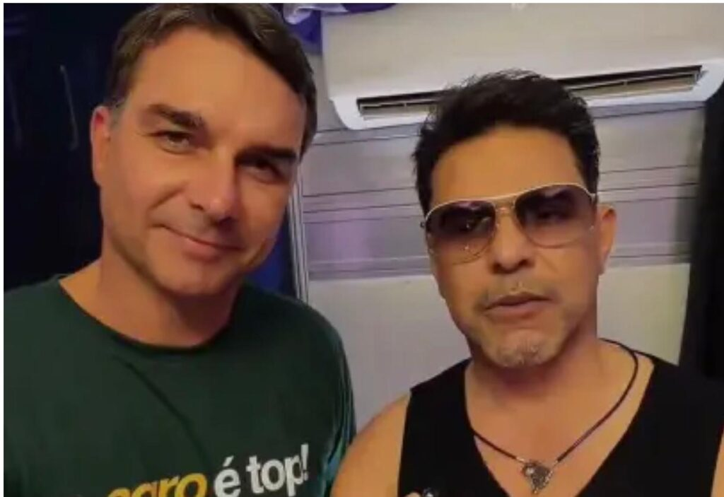 O senador Flávio Bolsonaro (PL-RJ) se encontrou com o cantor Zezé Di Camargo no camarim da 86ª Expogrande, uma das principais feiras do agronegócio do país, realizada em Campo Grande. Na ocasião, os dois gravaram um vídeo em apoio ao ex-presidente Jair Bolsonaro (PL), que cumpre prisão domiciliar humanitária em Brasília.