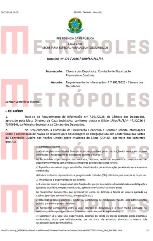 Segundo documento da Casa Civil, ao qual a coluna teve acesso, o governo alugou navios para hospedar delegações na COP30 por meio da “Qualitours Agência de Viagens e Turismo Ltda”.