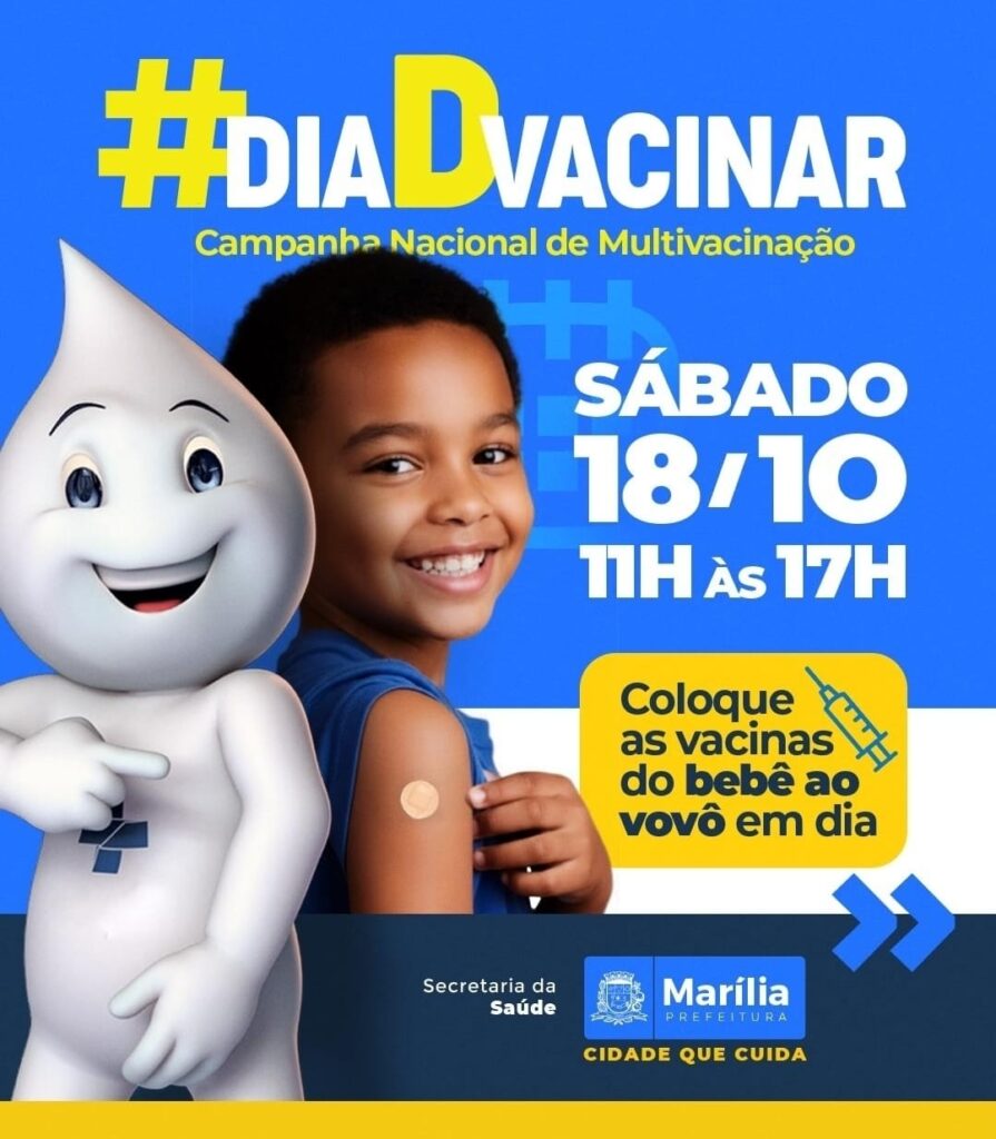 A Prefeitura de Marília, por meio da Secretaria Municipal da Saúde, realiza neste sábado (18), das 11h às 17h, o Dia D da Campanha Nacional de Multivacinação, organizado pelo Ministério da Saúde em todo o país.
