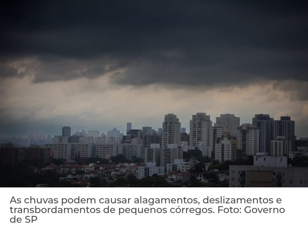 A Defesa Civil do Estado emitiu um alerta para a ocorrência de tempestades entre a noite de ontem (17) e o domingo (19), com chuvas de moderada a forte intensidade, queda de raios, rajadas de vento e possibilidade de granizo isolado em diversas regiões paulistas. As temperaturas devem variar entre mínimas de 7°C e máximas de 34°C pelo território paulista, com sensação térmica mais baixa nas áreas de maior altitude.