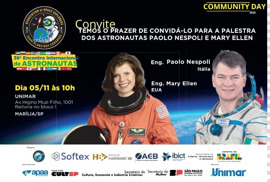 A visita dos astronautas faz parte do projeto Community Day, uma iniciativa que leva exploradores espaciais a instituições de ensino e pesquisa, aproximando estudantes e comunidade das experiências e aprendizados de quem já viveu a realidade do espaço. A Unimar receberá Mary Ellen Weber e Paolo Nespoli, os quais irão compartilhar suas vivências em missões espaciais, os desafios da vida em gravidade zero e o papel da ciência na construção de um futuro mais sustentável e interconectado.