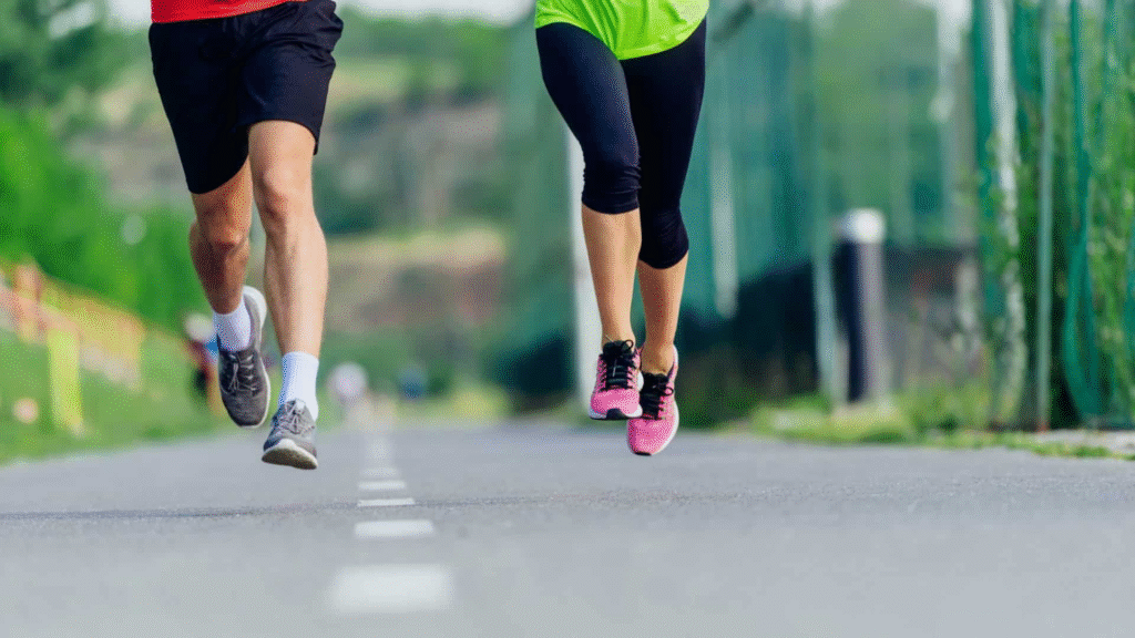 Imagem mostra um par de pernas femininas com tênis e roupa fitness, caminhando por uma rua