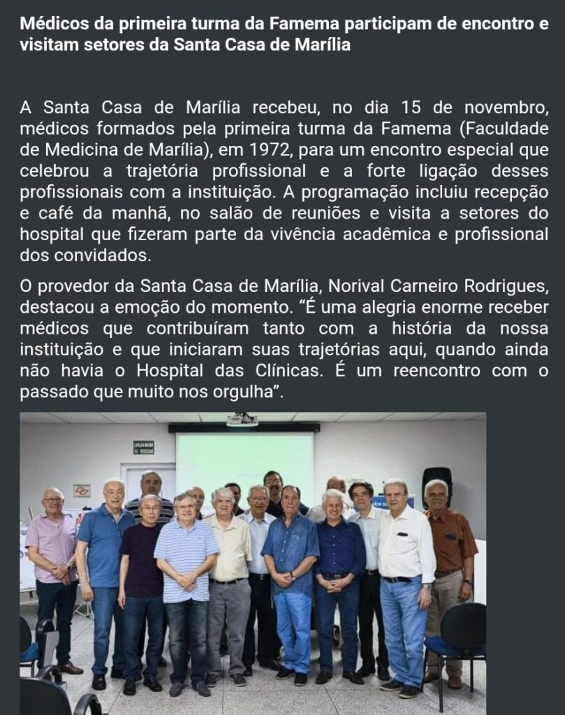 A Santa Casa de Marília recebeu, no dia 15 de novembro, médicos formados pela primeira turma da Famema (Faculdade de Medicina de Marília), em 1972, para um encontro especial que celebrou a trajetória profissional e a forte ligação desses profissionais com a instituição. A programação incluiu recepção e café da manhã, no salão de reuniões e visita a setores do hospital que fizeram parte da vivência acadêmica e profissional dos convidados.