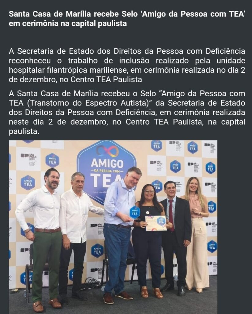 A Santa Casa de Marília recebeu o Selo “Amigo da Pessoa com TEA (Transtorno do Espectro Autista)” da Secretaria de Estado dos Direitos da Pessoa com Deficiência, em cerimônia realizada neste dia 2 de dezembro, no Centro TEA Paulista, na capital paulista.