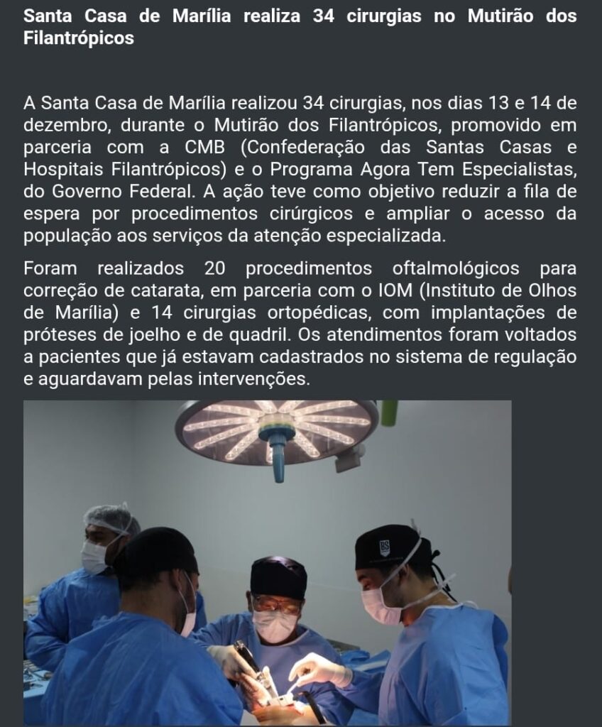 A Santa Casa de Marília realizou 34 cirurgias, nos dias 13 e 14 de dezembro, durante o Mutirão dos Filantrópicos, promovido em parceria com a CMB (Confederação das Santas Casas e Hospitais Filantrópicos) e o Programa Agora Tem Especialistas, do Governo Federal. A ação teve como objetivo reduzir a fila de espera por procedimentos cirúrgicos e ampliar o acesso da população aos serviços da atenção especializada.
