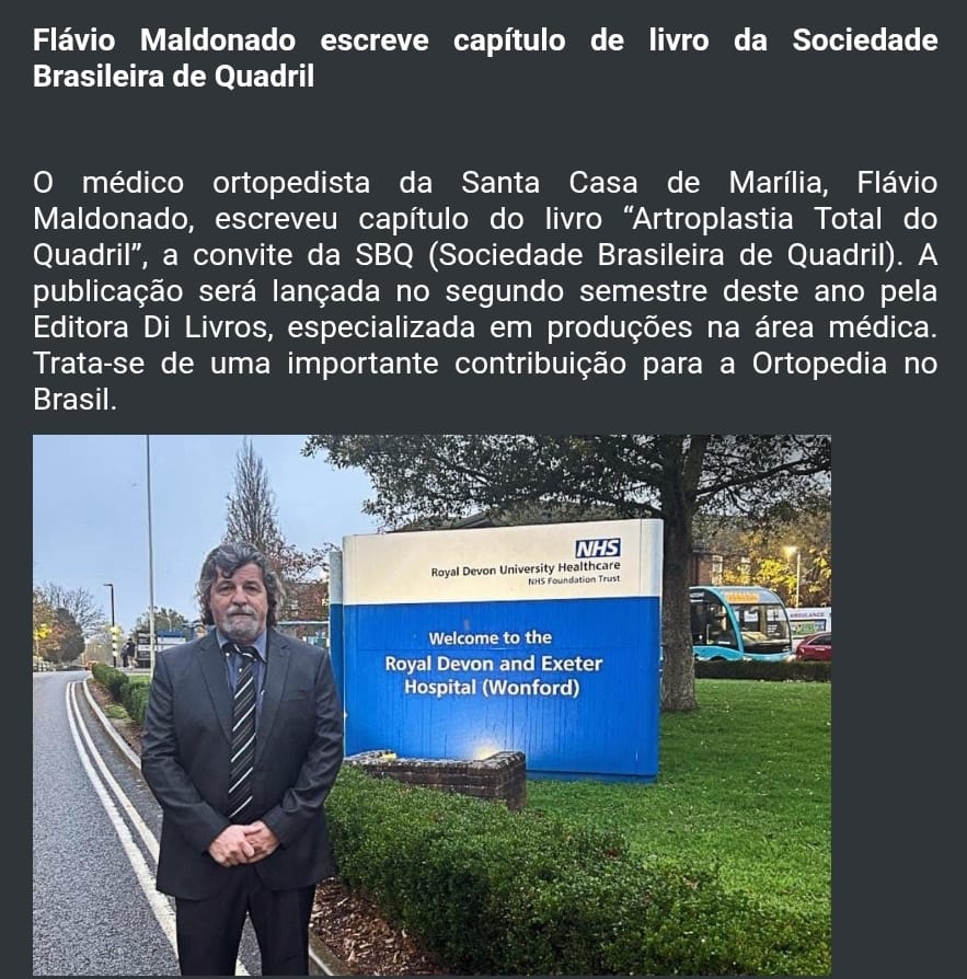 O médico ortopedista da Santa Casa de Marília, Flávio Maldonado, escreveu capítulo do livro “Artroplastia Total do Quadril”, a convite da SBQ (Sociedade Brasileira de Quadril). A publicação será lançada no segundo semestre deste ano pela Editora Di Livros, especializada em produções na área médica. Trata-se de uma importante contribuição para a Ortopedia no Brasil.