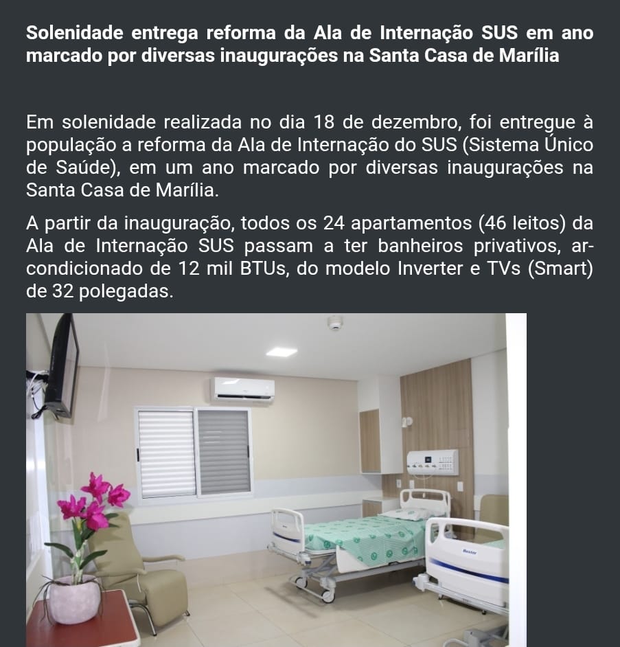 Em solenidade realizada no dia 18 de dezembro, foi entregue à população a reforma da Ala de Internação do SUS (Sistema Único de Saúde), em um ano marcado por diversas inaugurações na Santa Casa de Marília.