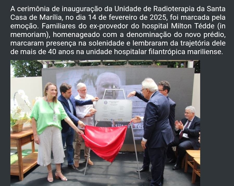 A cerimônia de inauguração da Unidade de Radioterapia da Santa Casa de Marília, no dia 14 de fevereiro de 2025, foi marcada pela emoção. Familiares do ex-provedor do hospital Milton Tédde (in memoriam), homenageado com a denominação do novo prédio, marcaram presença na solenidade e lembraram da trajetória dele de mais de 40 anos na unidade hospitalar filantrópica mariliense.