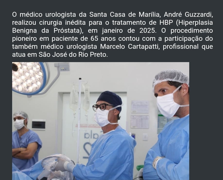 O médico urologista da Santa Casa de Marília, André Guzzardi, realizou cirurgia inédita para o tratamento de HBP (Hiperplasia Benigna da Próstata), em janeiro de 2025. O procedimento pioneiro em paciente de 65 anos contou com a participação do também médico urologista Marcelo Cartapatti, profissional que atua em São José do Rio Preto.