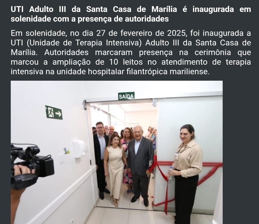 Em solenidade, no dia 27 de fevereiro de 2025, foi inaugurada a UTI (Unidade de Terapia Intensiva) Adulto III da Santa Casa de Marília. Autoridades marcaram presença na cerimônia que marcou a ampliação de 10 leitos no atendimento de terapia intensiva na unidade hospitalar filantrópica mariliense.
