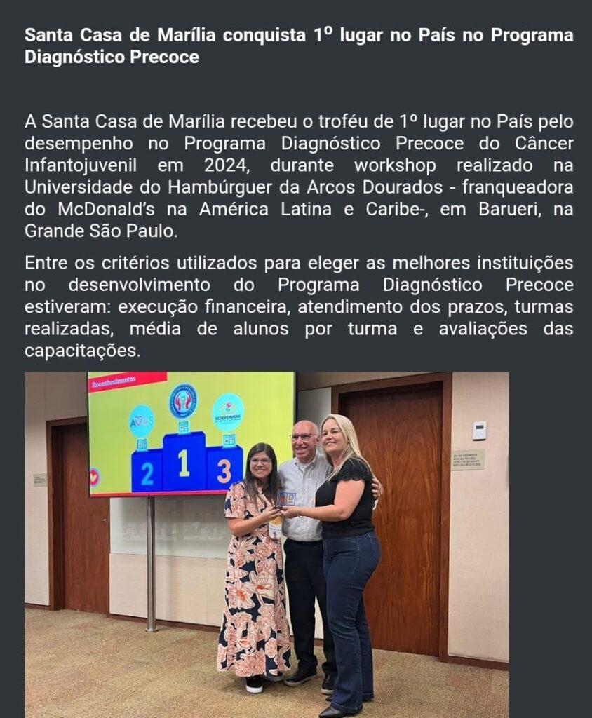 A Santa Casa de Marília recebeu o troféu de 1º lugar no País pelo desempenho no Programa Diagnóstico Precoce do Câncer Infantojuvenil em 2024, durante workshop realizado na Universidade do Hambúrguer da Arcos Dourados – franqueadora do McDonald’s na América Latina e Caribe-, em Barueri, na Grande São Paulo.