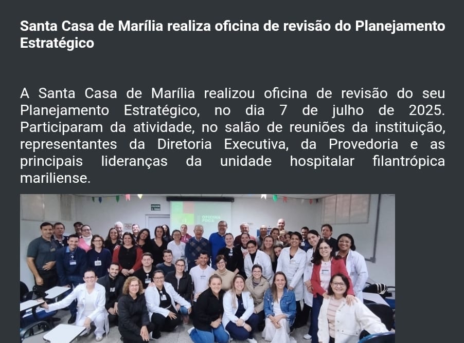 A Santa Casa de Marília realizou oficina de revisão do seu Planejamento Estratégico, no dia 7 de julho de 2025. Participaram da atividade, no salão de reuniões da instituição, representantes da Diretoria Executiva, da Provedoria e as principais lideranças da unidade hospitalar filantrópica mariliense.