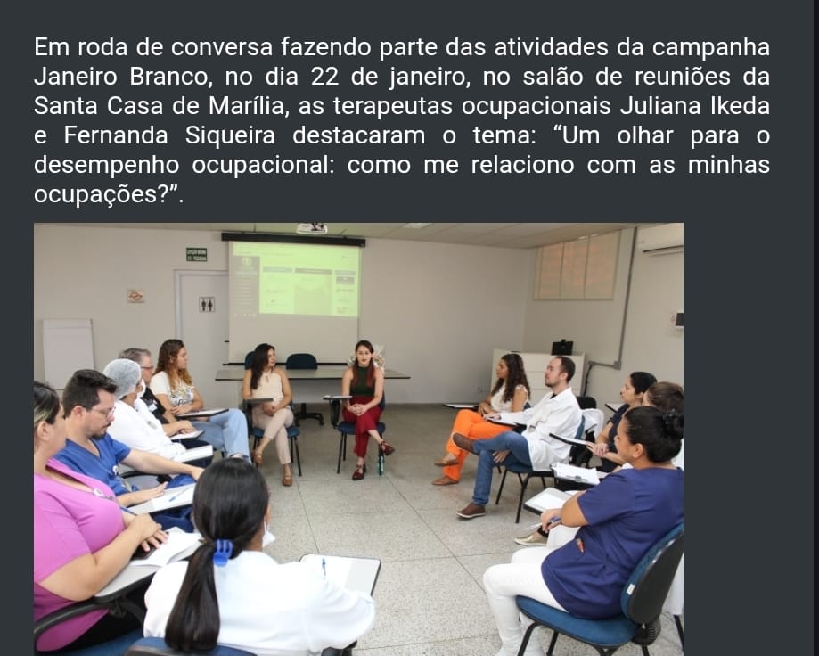 Em roda de conversa fazendo parte das atividades da campanha Janeiro Branco, no dia 22 de janeiro, no salão de reuniões da Santa Casa de Marília, as terapeutas ocupacionais Juliana Ikeda e Fernanda Siqueira destacaram o tema: “Um olhar para o desempenho ocupacional: como me relaciono com as minhas ocupações?”.