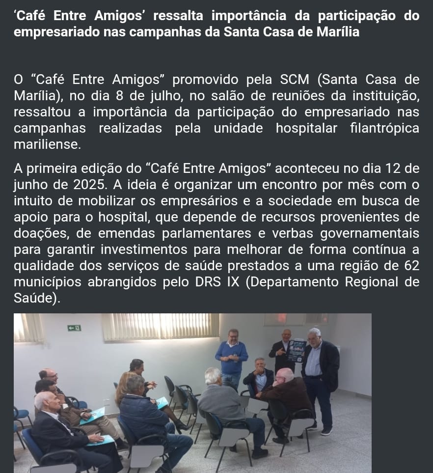 A primeira edição do “Café Entre Amigos” aconteceu no dia 12 de junho de 2025. A ideia é organizar um encontro por mês com o intuito de mobilizar os empresários e a sociedade em busca de apoio para o hospital, que depende de recursos provenientes de doações, de emendas parlamentares e verbas governamentais para garantir investimentos para melhorar de forma contínua a qualidade dos serviços de saúde prestados a uma região de 62 municípios abrangidos pelo DRS IX (Departamento Regional de Saúde).